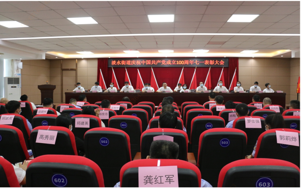 為慶祝建黨 100 周年,表彰先進典型,6 月 30 日,淡水街道在五樓大會議室舉辦慶祝建黨 100 周年暨“七一”表彰大會,激勵各級黨組織和廣大黨員不忘初心,牢記使命,奮發有為,勇當先鋒。街道班子成員、各辦(公司)負責人、各村社區黨組織書記、各派出所所長、各市場監督管理所所長以及受表彰的先進個人和黨組織等約 170 人參加會議。